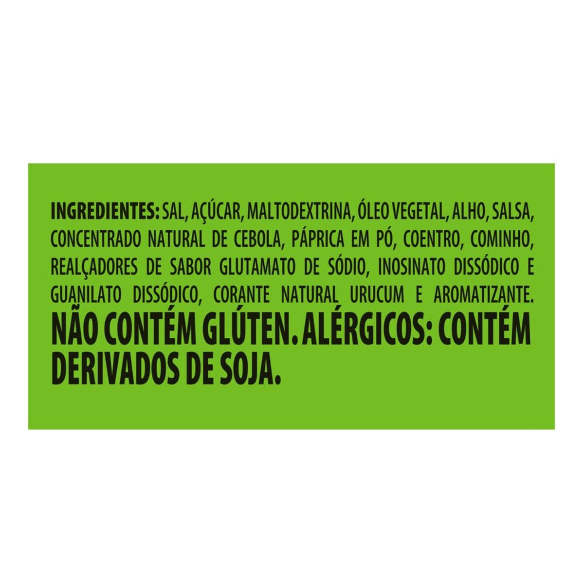 | Ingredientes | Sal, açúcar, maltodextrina, óleo vegetal, alho, salsa, concentrado natural de cebola, páprica em pó, coentro, cominho, realçadores de sabor glutamato de sódio, inosinato dissódico e guanilato dissódico, corante urucum e aromatizante. |